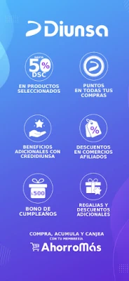Descarga la aplicación de Diunsa y disfruta de una experiencia de compra conveniente, segura y llena de beneficios. Gana puntos por cada compra, al vincular tu membresía Ahorro Más. ¡Obtén los mejores descuentos y mucho más! ¡Descarga la APP ahora!